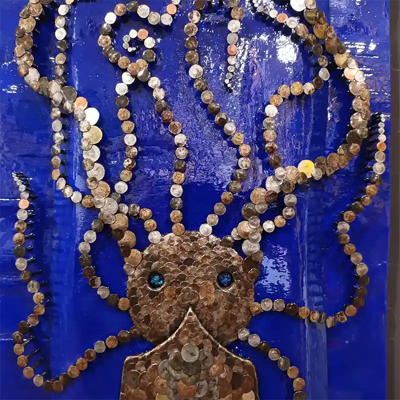 U djelima Roberta Škunce izbliza otkrivamo svijet u kojem čavli postaju valovi, sjene postaju dubine, a metal poprima mekoću mora. Reljefi nastaju vještim prilagođavanjem visine čavala, dok se nijanse postižu brušenjem ili oksidacijom vatre. Ono što izdaleka djeluje kao crtež, iz neposredne blizine otkriva se kao fascinantna topografija strpljivog rada i majstorskog osjećaja za svjetlo i volumen.